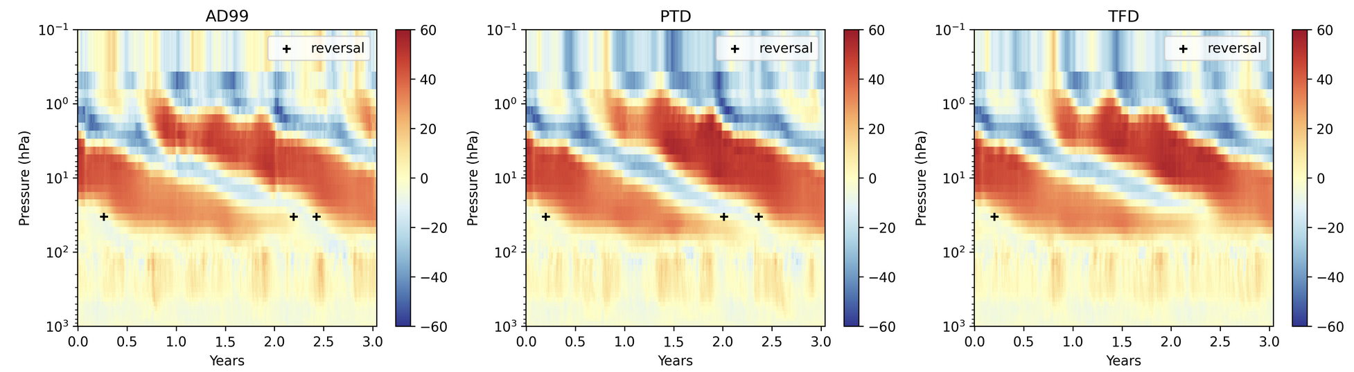Time-height sections of zonal-mean zonal wind (m/s) averaged between ±5o longitude